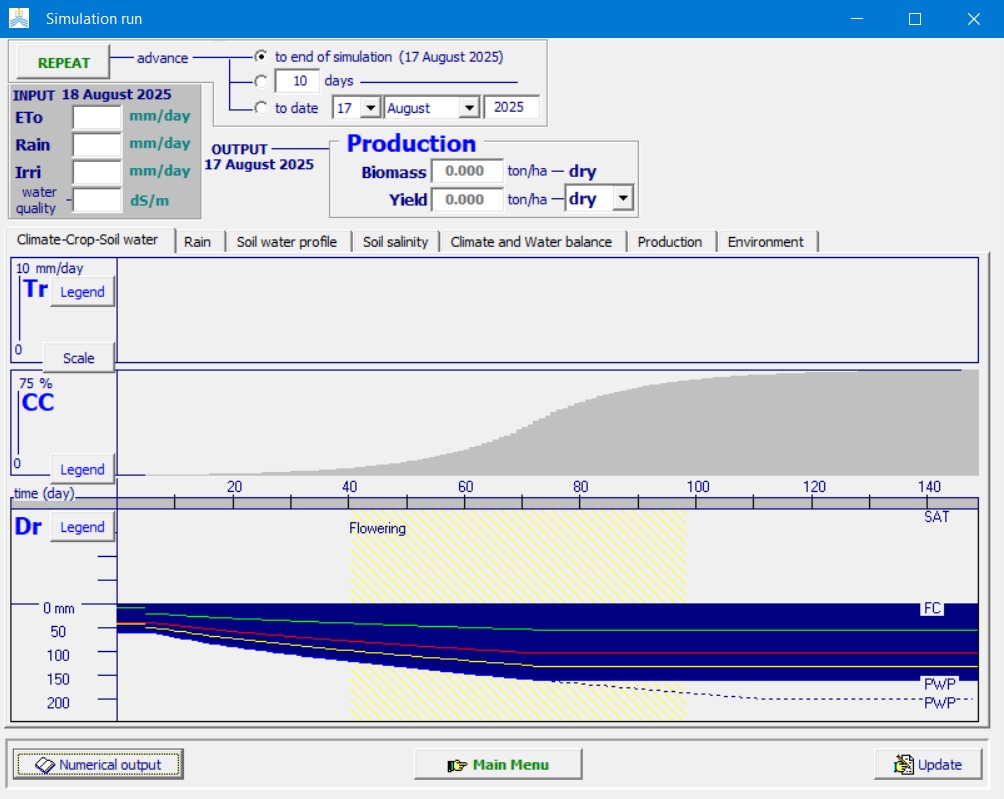 Figure 5: AquaCrop simulation dashboard illustrating the environmental input parameters and biomass development modeling used to inform the VERP logic.