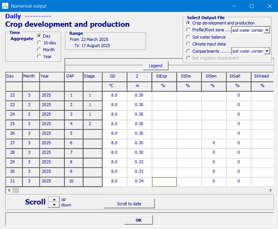 Figure 4: Numerical output from FAO AquaCrop used to establish baseline transpiration stress and canopy expansion parameters for the model.