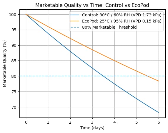 Fig 3: Comparative simulation of produce marketable quality over 6 days. The EcoPod model (VPD 0.15 kPa) demonstrates a significant extension in shelf life compared to standard ambient conditions (VPD 1.73 kPa)